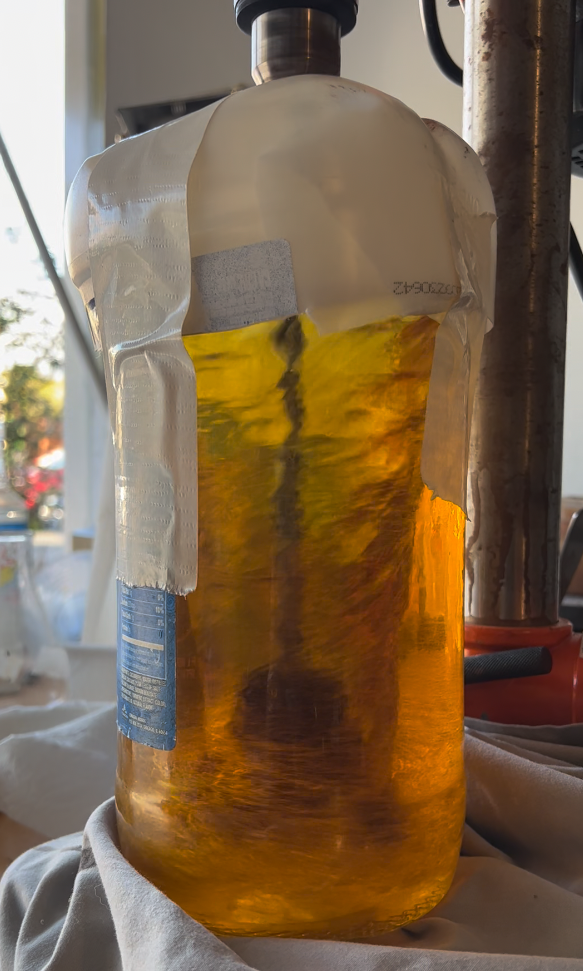 This first batch was a success, but the process left something to be desired. The drill battery kept dying, so we kept having to switch it out and eventually just stop and wait while it charged. Plus, the drill doesn’t get the same RPMs that the video laid out. So for the second batch, I went out and got a drill press off Craiglist — which was powerful enough to need a splash guard (something we learned the hard way, oops, don’t worry, everybody is fine).
